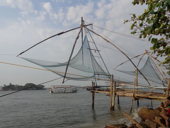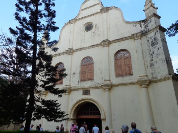 Notre excursion du jour nous a amené dans le vieux quartier de Cochin pour y voir les églises construites initialement par les Portugais. On est aussi allé visiter une vieille synagogue parce qu’à l’époque beaucoup de Juifs sont venus à Cochin. C’était pas mal mais on reste éberlué en voyant cette fourmilière, on vous accoste partout pour entrer dans une échoppe ou pour vous vendre des bibelots, ça klaxonne sans arrêt, les tuk tuk et les scooters vous frôlent, en bref on doit toujours être sur ses gardes. Après, on est monté sur un bateau pour une balade dans le port et on a pris un petit goûter dans les jardins de l’ancien gouverneur. Quand on est rentré au bercail, on était lessivé.