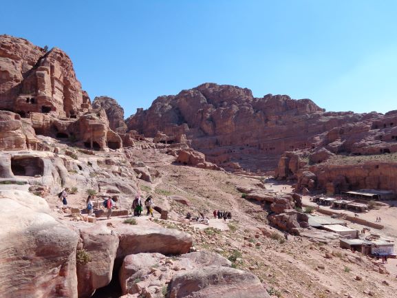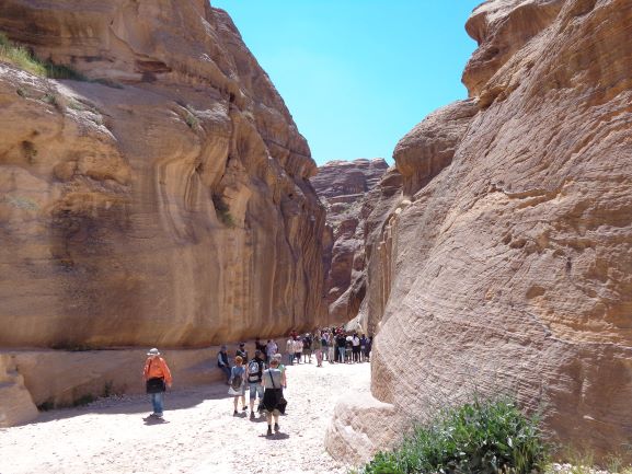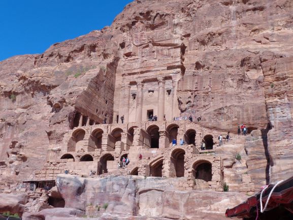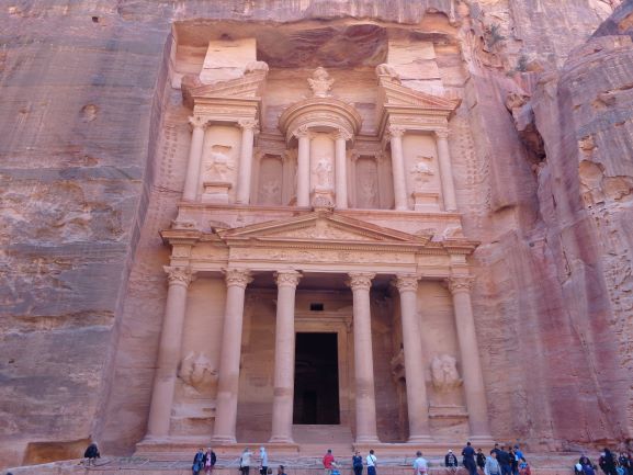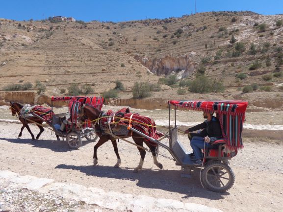 En Jordanie, il commence à faire un peu frisquet et on a ressorti les petites laines. Notre excursion du jour était destinée au site de Petra, 6e dans la liste des 1000 merveilles du monde. Le bus nous a d’abord emmené faire l’arrêt pipi obligatoire dans un magasin-bazar perdu au milieu de nulle part avec plein de bibelots tous plus kitch les uns que les autres, puis on est allé dans un superbe restaurant pour le repas de midi, c’était vraiment très bon. En face du restaurant, on est entré dans le site de Petra et on a dû marcher durant un peu plus d’un kilomètre (en descente) pour atteindre le clou du spectacle, le fameux trésor de Petra. On doit d’abord passer par une gorge très étroite, magnifique. C’est les Nabatéens qui se sont cassés la nénette à creuser tout ça. En fait, le trésor de Petra (la photo qu’on voit partout) n’est qu’une petite partie du site, il y a une ribambelle de tombeaux creusés en peu partout et aussi des grottes où ces braves Nabatéens habitaient. C’est fantastique et beaucoup plus grand que l’on imagine. Dans tout le site, il y a beaucoup de vendeurs de bibelots mais également des gars qui vous proposent de faire une partie de la montée du retour en chameau, ou en charrette tirée par un cheval ou à dos de mulet ou à cheval. On a préféré utiliser nos petites gambettes pour le retour. Comme prévu, avec la montée, pas mal de potes-passagers étaient bien en retard au bus, ils étaient complètement lessivés.